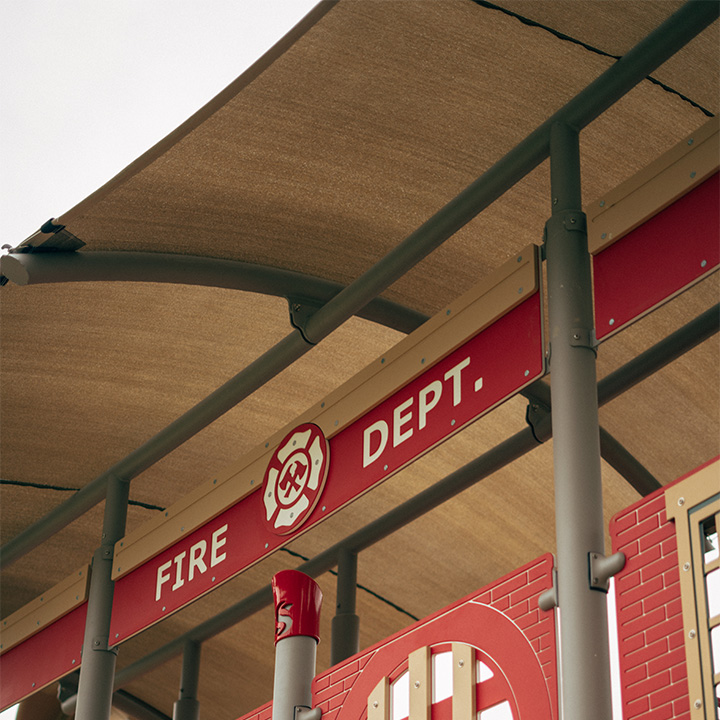 The Fire Station playground is fully completed with an integrated shade topper to protect the children and equipment from harmful UV rays. The fabric shade is supported by steel frames to create an arch that provides expansive shade over the playground.
