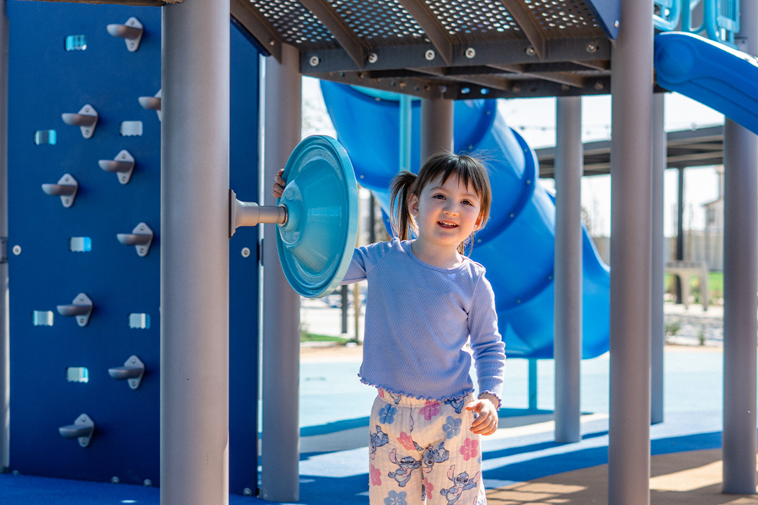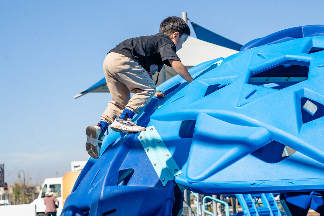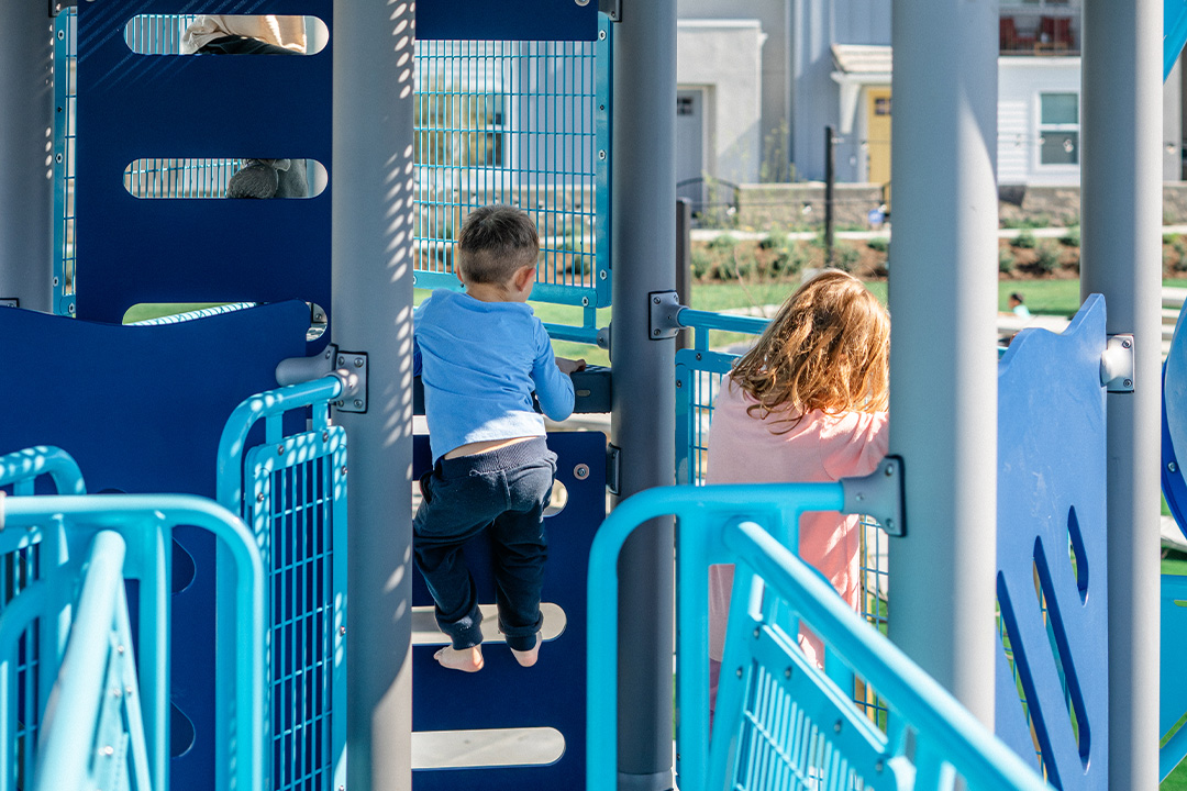 The design included two playgrounds built for different age groups and abilities. The steel tower playground features 14-foot towers and challenging climbing and slide elements to cater to older children. The smaller playground features slides and climbers with lower fall heights more appropriate for young children.