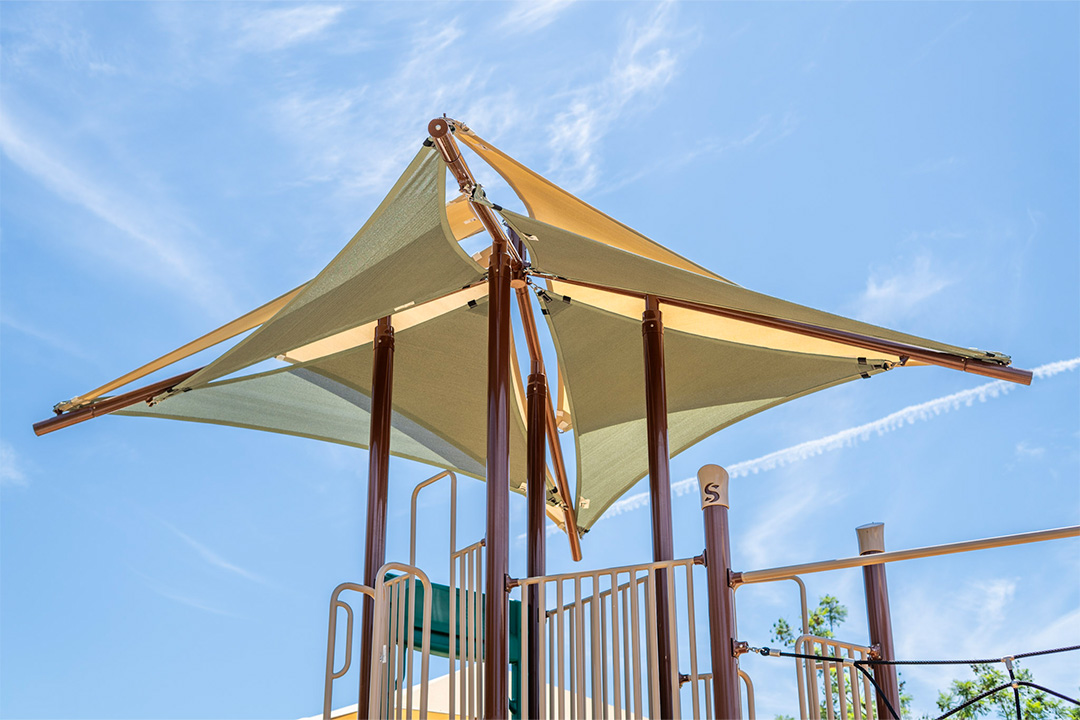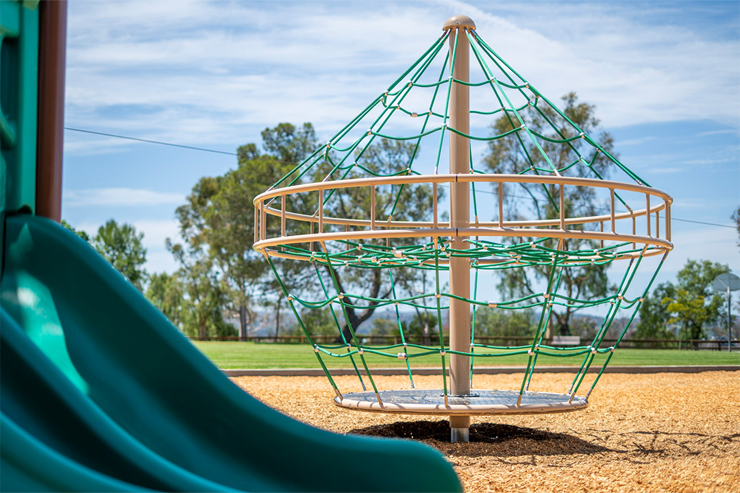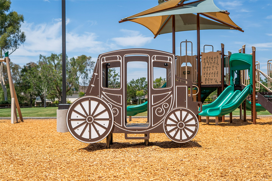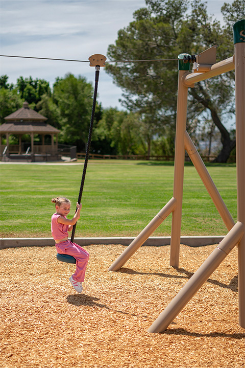To create a cohesive and varied playground we added a zip-line, swing set, a stage coach play vehicle, and a rotating rope climber. These additional freestanding structures added play value and created a more unique space.