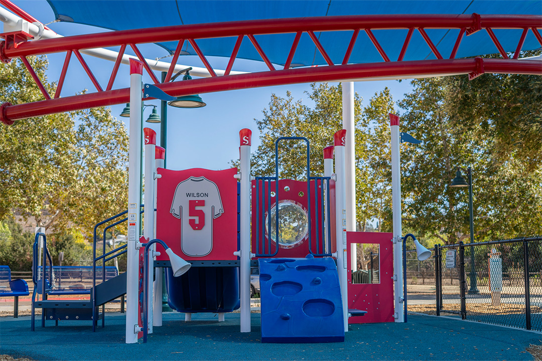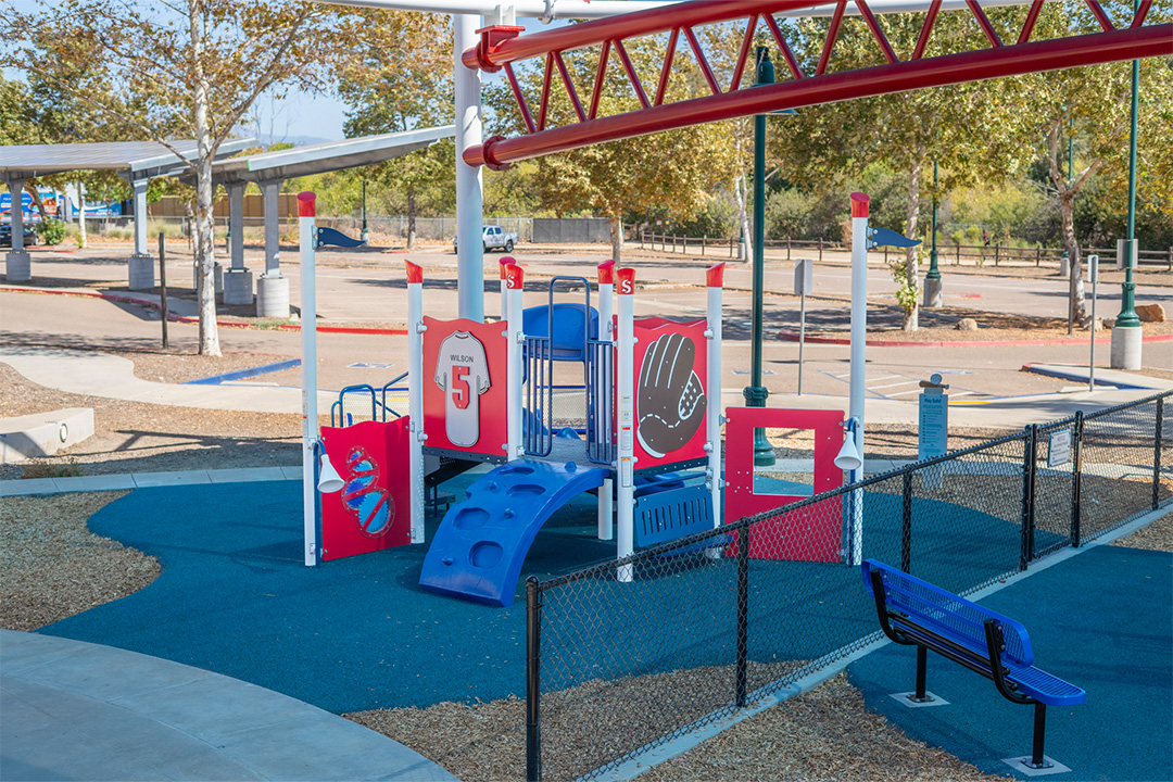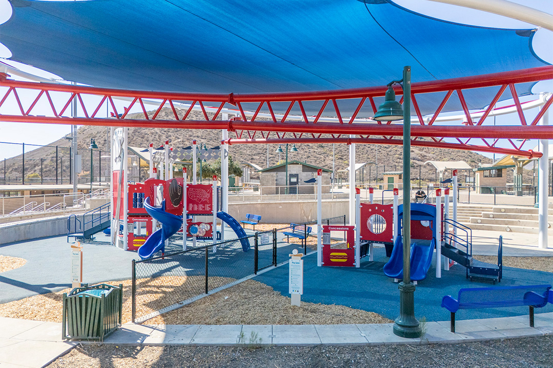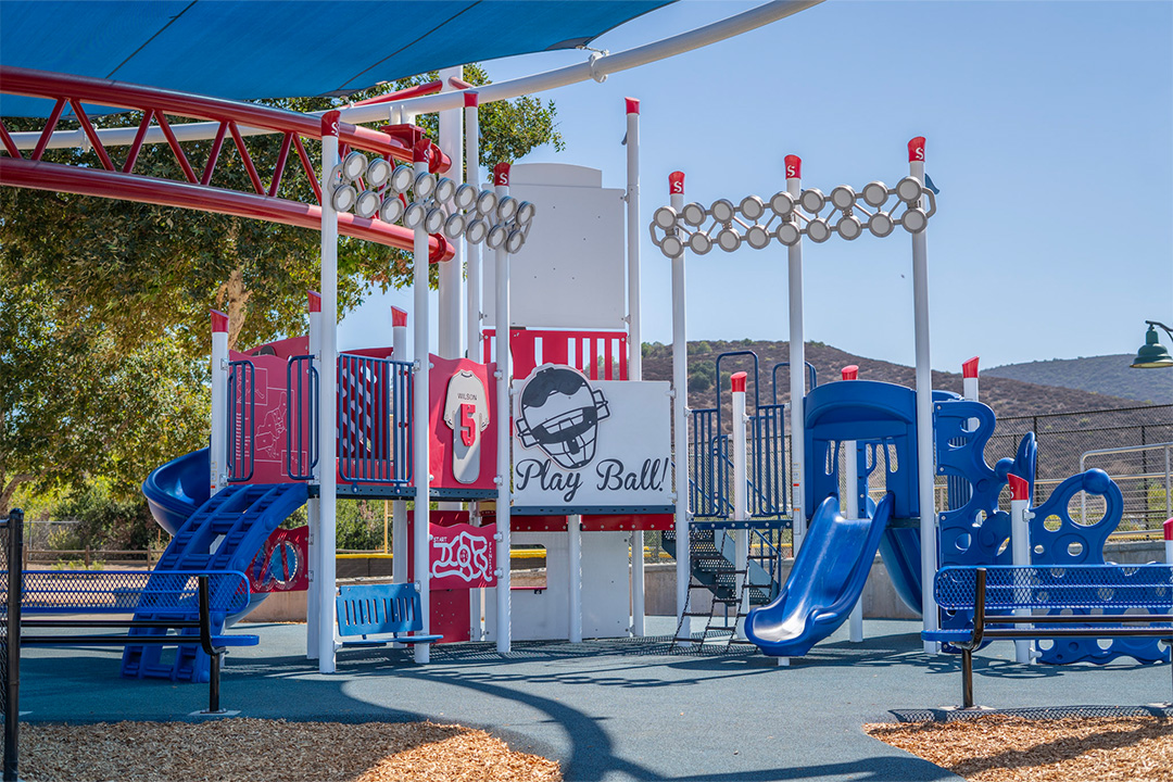 At Zoom, themes are our specialty! We designed a custom baseball shade structure structure to protect the playground equipment.